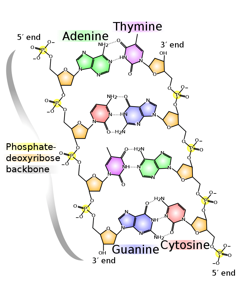 Desde entonces, otros estudios han investigado esta nueva letra del ADN en términos de vías sintéticas y estructura dentro del ADN, pero con resultados limitados. El ADN (ácido desoxirribonucleico) está compuesto por una columna hecha de grupos fosfatos que se alternan con ribosas. Estos fosfatos le dan las propiedades acídicas al ADN, mientras que el azúcar es una pentosa llamada 2-desoxirribosa. La parte nucleica del nombre viene de nuestro código de cuatro letras, los nucleótidos. Los nucleótidos mantienen las dos hebras en la forma de una doble hélice a través de una fuerza de atracción hecha por puentes hidrógeno. Los pares A-T forman dos puentes hidrógeno, mientras que los C-G forman tres, como se observa en la figura.