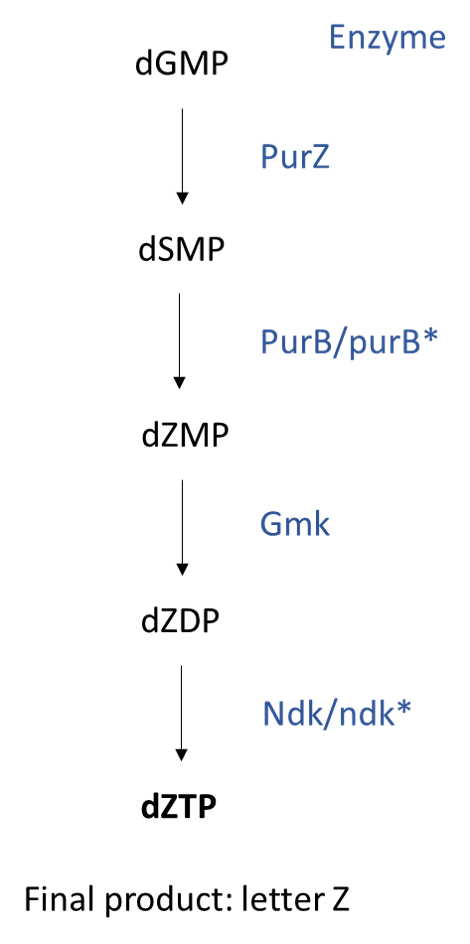 Usando distintas mutantes, Sleiman y sus colegas mostraron qué enzimas eran esenciales para sintetizar el nuevo nucleótido, y fueron capaces de describir la síntesis desde dGMP (guanina monofosfato) a dZTP (Z trifosfato). Ellos mostraron que las mutantes de purB* tenían una eficiencia de infección más baja, mientras que las mutantes de ndk* no infectaban las células en absoluto. Estos resultados destacan que estos genes son necesarios para la síntesis de dZTP, y sin ellos los fagos no pueden replicarse.