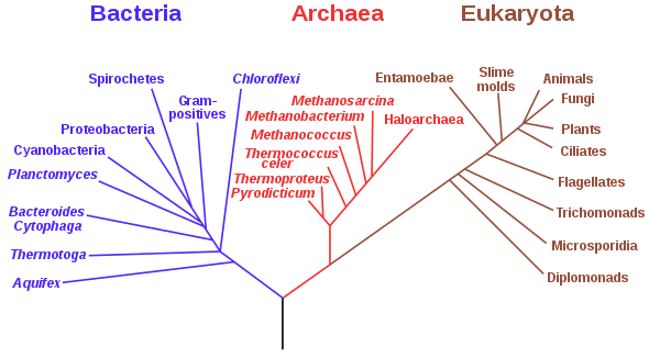 Что ж, археи представляют собой один из доменов жизни. Как видно на изображении снизу, это филогенетическое дерево подразделяются еще на два домена: бактерии и эукариоты (клетки с ядром). Подобно бактериям, археи являются прокариотами, однако их клеточная мембрана отличается как от бактерий, так и от эукариотов. Их механизмы репликации ДНК и трансляции тесно связаны с теми, что найдены у эукариотов. Получается, что по некоторым характеристикам археи похожи на бактерии, а по другим – на эукариотов, но при этом обладают своими уникальными особенностями. Большинство архей обитают в экстремальных условиях (например, в условиях высокой температуры или высокой солености), но некоторые виды встречаются и в человеческом кишечнике.