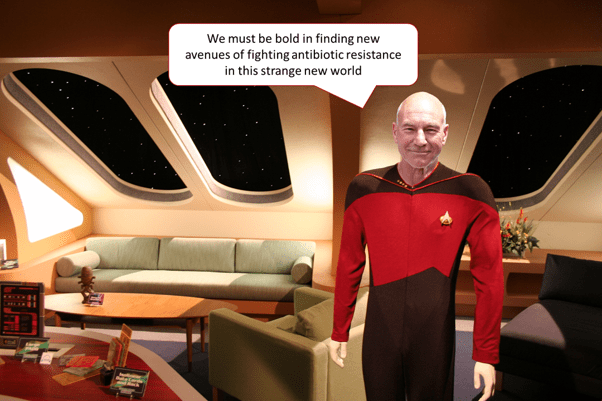 Another tool P. aeruginosa has in its infection repertoire are phenazines – molecules that scavenge iron and other nutrients for its host (4). Because of this scavenging ability, among other functions, phenazines, directly and indirectly, kill other bacteria in the vicinity (essentially taking a MicroBite out of the competition – sorry I had to). Following our metaphor, the phenazines could be considered as the “Phasers” of the Enterprise.