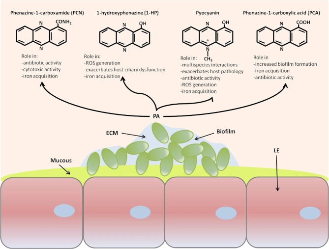 Turns out that both biofilms and phenazines are closely linked – for biofilms to form, nutrients need to be supplied to the bacteria. But to get these nutrients, the bacteria need to produce phenazines. As an interesting note, while phenazines are produced all the time by the bacterium, phenazine production is significantly enhanced during biofilm formation. So, could phenazines be the target of therapeutics? As an enticing tidbit, P. aeruginosa strains that cannot produce phenazines are more susceptible to antibiotics.