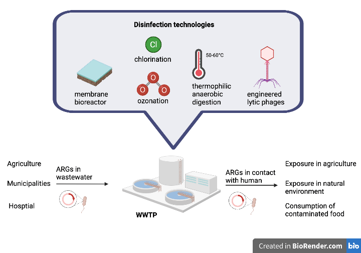 Geavanceerde benaderingen om dit probleem aan te pakken omvatten desinfectietechnologieën zoals membraanbioreactoren, chlorering, ultravioletstraling, ozonatie, thermofiele anaërobe vergisting of gemanipuleerde lytische fagen (figuur 1). Met al deze technologieën wordt geprobeerd te voorkomen dat micro-organismen hun weg vervolgen van afvalwater naar rivieren en oceanen waar zij in contact kunnen komen met mensen, dieren en planten. Sommige van deze technologieën onderbreken de communicatieroutes tussen micro-organismen, zodat de uitwisseling van antibioticumresistentie-genen minder waarschijnlijk wordt. Helaas geven micro-organismen zich niet gemakkelijk gewonnen en hebben de huidige desinfectietechnologieën bepaalde beperkingen.