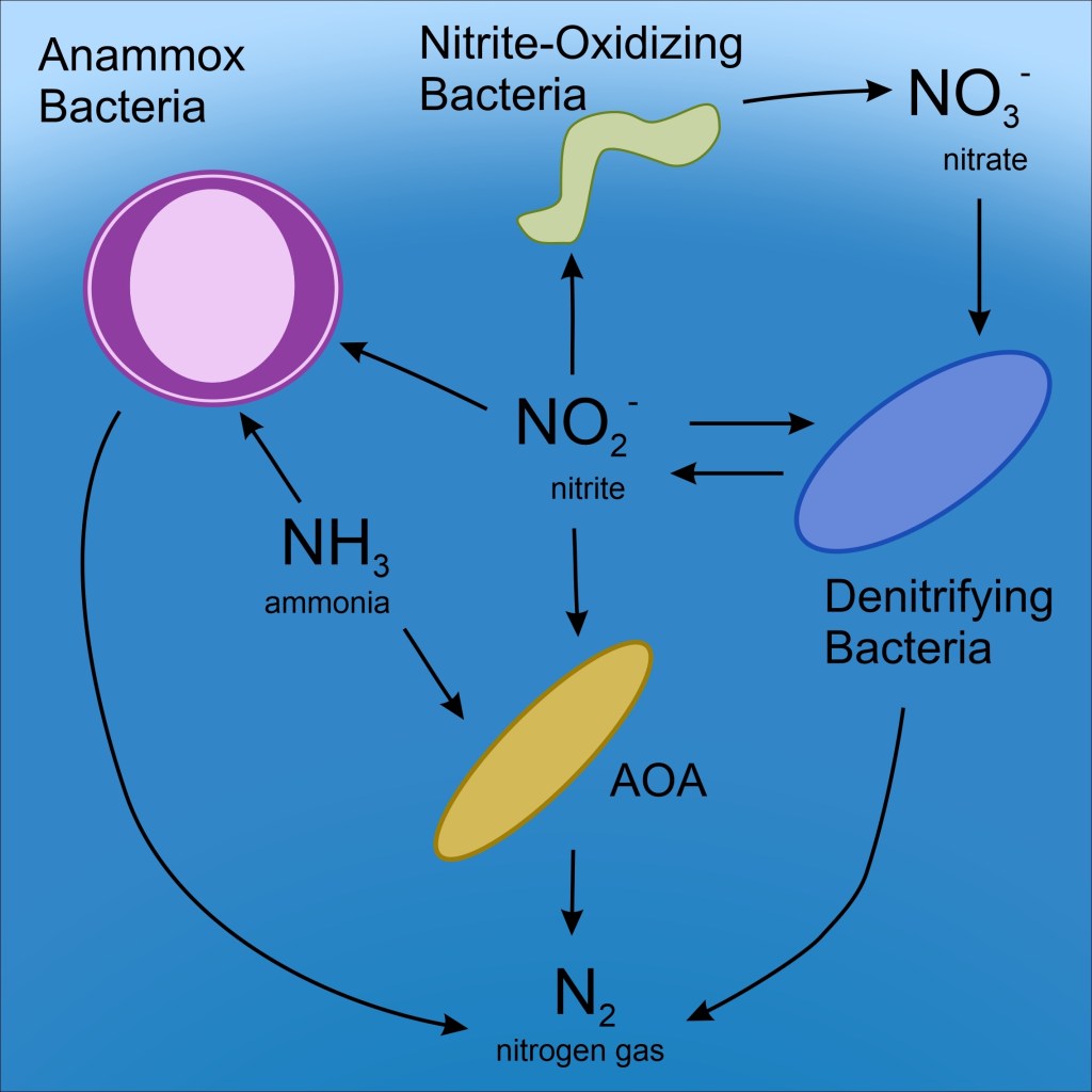 Однако, конкуренция с другими микробами может ограничить производство кислорода (Изображение 3). В районах океана с низким содержанием кислорода нитрит накапливается в низких концентрациях, и многие другие микробы могут превзойти АОА в борьбе за любой избыток нитрита. Например, Холлибо считает, что денитрифицирующие бактерии (бактерии, которые могут «дышать» нитритом), вероятно, используют нитрит быстрее, чем археи.