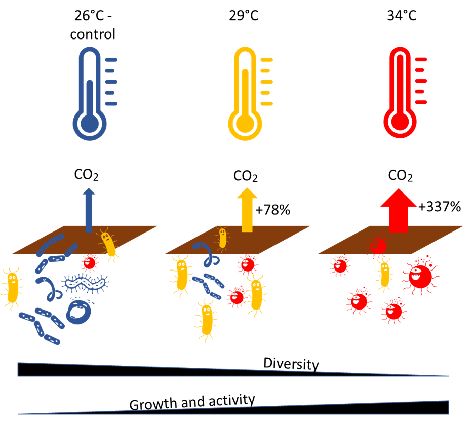 Zij gingen naar een tropisch bos in Panama en installeerden grote kachels in de bodem om de bodem op te warmen van 26°C (controle, niet opgewarmd), tot 29°C (+3°C) en 34°C (+8°C), overeenkomstig de opwarming die tegen het eind van deze eeuw wordt voorspeld als er niets wordt gedaan om de klimaatverandering te beperken. Elke week maten zij de koolstofdioxide-uitstoot van de bodem en verzamelden zij monsters om de microbiële gemeenschappen te karakteriseren. Zij stelden vast dat na twee jaar opwarming de microbiële diversiteit afnam en de microbiële gemeenschappen veranderden om stress- en hittebestendige bacteriën en schimmels te bevorderen. Nog verontrustender is dat de kooldioxide-uitstoot met 78% toenam bij een stijging van 3°C en met 337% bij een stijging van 8°C! De auteurs onderzochten waarom de kooldioxide-uitstoot zo sterk toenam met de opwarming en toonden aan dat bodemmicro-organismen van warme temperaturen houden: ze groeien sneller en hun enzymatische activiteit neemt toe.