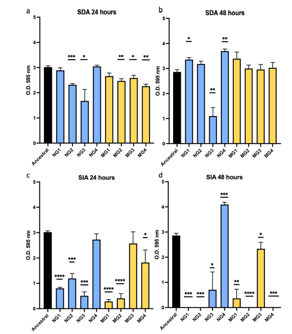 Parlons maintenant de l’adhésion. Elle se produit en présence de saccharose via des mécanismes dépendants (SDA) et indépendants (SIA) du saccharose. Si le premier est nécessaire pour l’attachement initial, le second est responsable de la virulence et de la pathogénicité. Les chercheurs ont cultivé des colonies bactériennes dans des conditions de gravité normale (NG) et de microgravité simulée (MG) pendant 100 jours, puis ont analysé les résultats. Comme le montre la figure 4, les mécanismes dépendants et indépendants du sucre se sont comportés de manière différente. Le groupe SDA a été à peine affecté par les conditions de microgravité. Au contraire, le groupe SIA a montré quelques variations phénotypiques, alors que certaines colonies bactériennes (en gravité normale et en microgravité) n’ont pas réussi à adhérer à la surface. Toutefois, cela ne signifie pas que ces résultats seraient universels pour toutes les expériences similaires menées à l’avenir. Les auteurs de l’article expliquent comment il peut être problématique de prédire l’influence de l’environnement de sélection (c’est-à-dire l’environnement spatial) sur ce phénotype [adhésion de S. mutans aux surfaces].