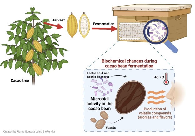 Onderzoekers in Ecuador, waar cacao een economisch belangrijk gewas is in de agro-industrie van het land, onderzochten de diversiteit van micro-organismen tijdens spontane fermentatie van Nacional x Trinitario cacaobonen. Deze nichecultivar staat bekend als cacao met een fijn aroma en wordt veel gevraagd voor de productie van de fijnste chocoladerepen. Ze slaagden erin om meer dan 240 micro-organismen uit de commerciële cacaoproductie te isoleren, te kweken en te identificeren. Bacteriën van de geslachten Lactiplantibacillus en Acetobacter (47%) en gisten van het geslacht Saccharomyces (17%) waren het meest relevant voor fermentatie. De groei van deze microben werd getest op tolerantie voor verschillende temperaturen en pH-waarden. Daarnaast werden suikers zoals glucose, fructose en andere stoffen aan het kweekmedium toegevoegd. Op basis van hun prestaties en tolerantie voor verschillende kweekomstandigheden werden L. plantarum, A. pasteurianus en S. cerevisiae geselecteerd als de optimale micro-organismen voor cacaofermentatie.