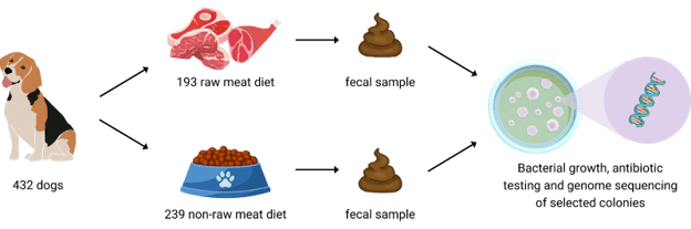 The study involved 432 dogs from the UK, 193 of them were fed a raw meat diet and 239 were fed a non-raw meat diet. Fecal samples were collected from both groups and smeared on an agar plate to study the bacteria that are present. Typical E. coli colonies were selected, grown and tested for resistance against antibiotics used in dogs and humans by the disk diffusion test. This involves placing one or more round paper(s) saturated with an antimicrobial agent (antibiotic disks) on the agar media on a Petri dish, incubating the plate to grow the bacteria and measuring the incubation zone around each disk.