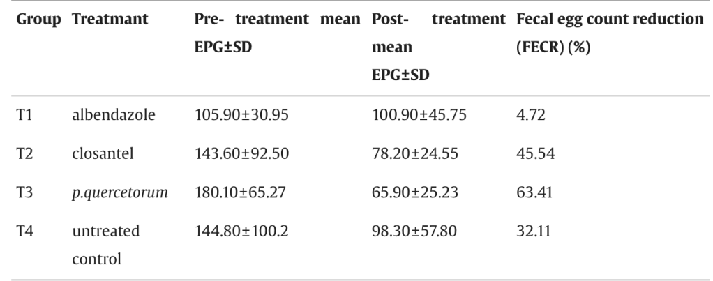 What the researchers found was that the goats treated with P. quercetorum had the greatest reduction in fecal egg count at the end of treatment (Table 1). Interestingly, groups treated with albendazole and closantel had lower levels of fecal egg reduction than typical indicating concerns for resistance. With these results, further studies are needed to help understand which chemicals are contributing to the anthelmintic properties and purifying those compounds to determine dosage and safety.
