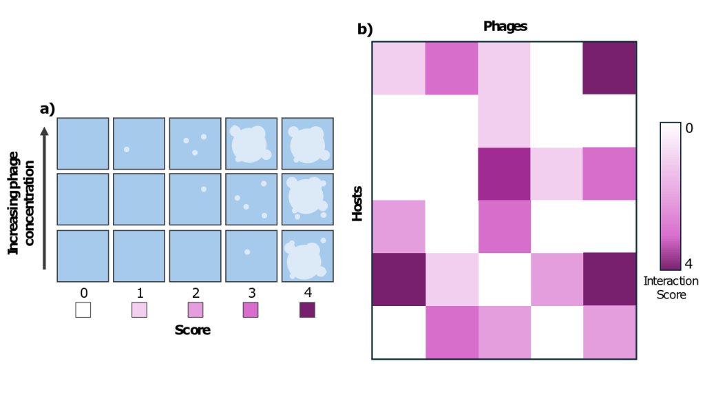 b) By adding each phage to each bacterium, the authors created a matrix of interactions between phages and hosts, ranked according to the system outlined in a).