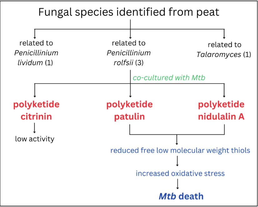 Considerable efforts have been made to screen various compounds that will help shorten the duration of Mtb treatment. A great option is to screen the natural environmental reservoirs of Mtb, such as the grey decomposition layer below the active growth layer of Sphagnum peat bogs. Peat mosses of the Sphagnum genus are closely linked to a complex population of microorganisms that live on their surface and in their tissues, forming a complex Sphagnum microbiome. Bacterial and fungal species coexist in this microbiome and struggle for scarce nutrients released when the peat moss cell walls break down. Since this habitat supports the largest concentration of Mycobacteria discovered anywhere in nature yet, it makes sense for the co-inhabiting fungi to produce secondary metabolites that will kill the bacteria and improve their competitiveness and survival.