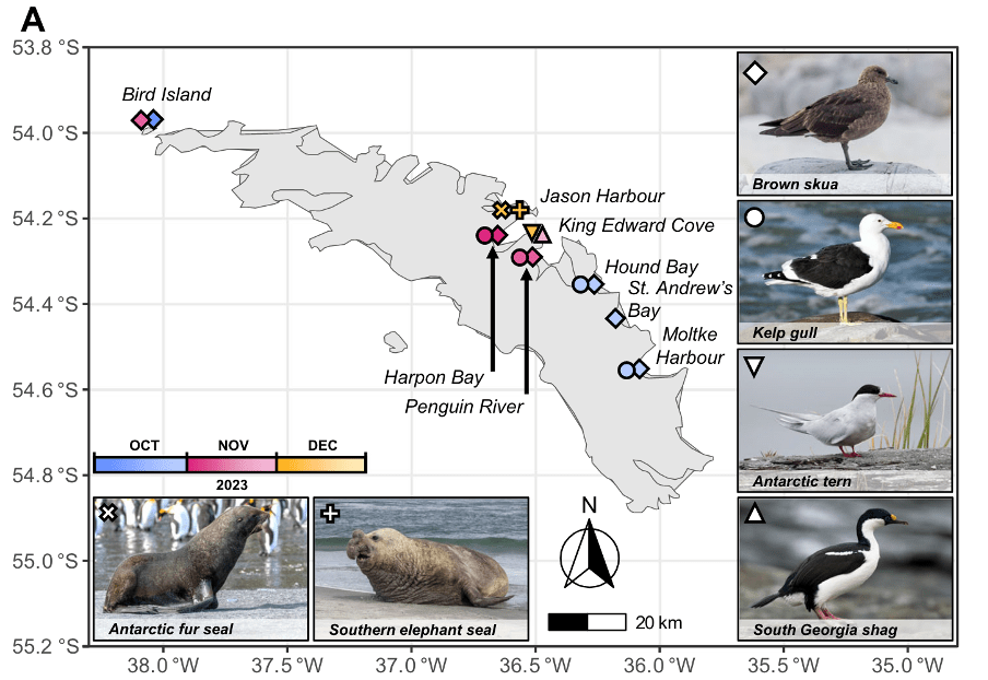 A recent study by Banyard, et al showed for the first time the presence of HPAIV H5N1 in animals from Antarctic regions, such as Brown skua, Kelp gull, Antarctic tern, South Georgia shag, Southern elephant seal, Antarctic Fur Seal, Black-browed albatross, and Southern fulmar. The study was performed in South Georgia and the Falkland Islands, close to the Patagonia region, in October through December 2023. Although the authors tested penguins on these islands, they were negative for the presence of the virus; however, another study by Fabiola León, et al. suspects that penguins and shags from the continental Antarctic are infected with H5N1, suggesting the virus arrived in the region by other routes.