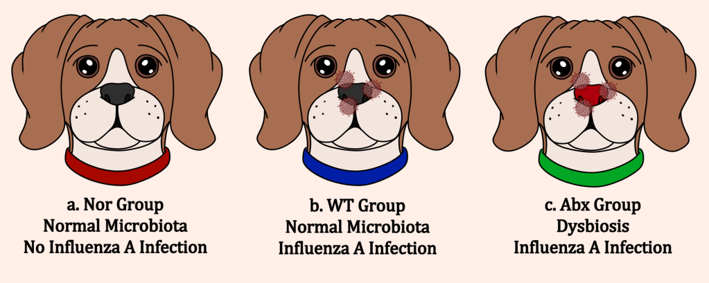In this study, Geng and their team sought to show a direct link between the upper and lower respiratory tract microbiota and susceptibility to influenza viruses, as well as begin an understanding of the underlying mechanisms behind this association. To do so, they established three groups of dog models: the Nor group, which received no antibiotic treatment to disrupt the nasal microbiota (no dysbiosis) and was not exposed to influenza A, the wild type (WT) group, which received no antibiotic treatment as well but was exposed to influenza A, and the Abx group, which received antibiotic treatment (causing dysbiosis) and was exposed to influenza A (Figure below).