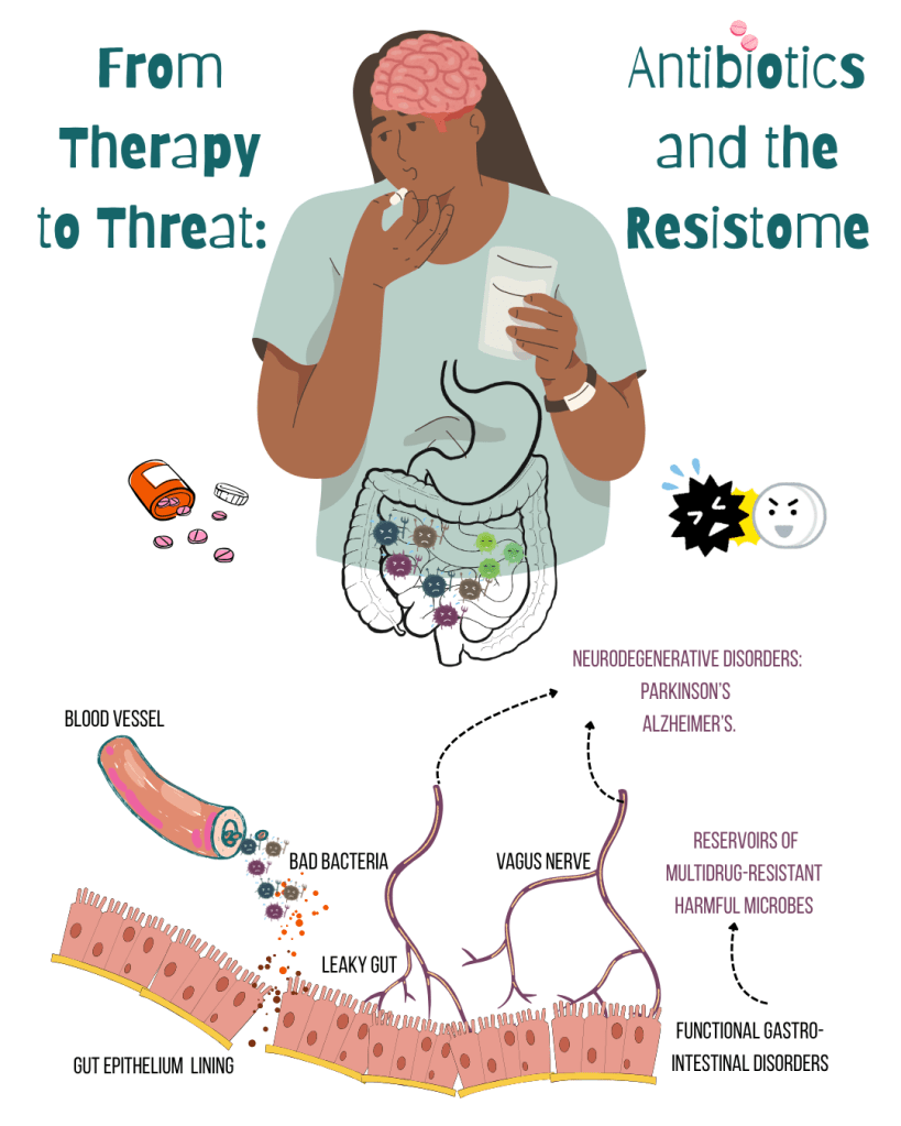 But antibiotics, especially broad-spectrum ones, can’t tell “friend from foe”! Loss of SCFA-producing microbes weakens gut barriers and the gut becomes more permeable—a phenomenon often referred to as a “leaky gut”, allowing a fat-and-sugar molecule from Gram-negative bacteria– lipopolysaccharides (LPS) to enter the bloodstream; triggering chronic inflammation, metabolic disorders & neuroinflammation. As these “good bacteria” decline, harmful and opportunistic organisms—like Clostridioides difficile and enterococci resistant to antibiotic vancomycin—step in to fill the void.