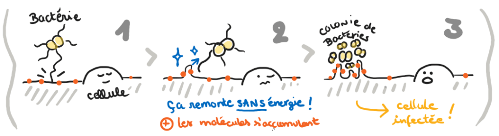 Pour expliquer ce phénomène, le modèle – proposé dès 2018 par A. Charles-Soyer et collaborateur·rices – est que ces déformations apparaissent par mouillage de la membrane cellulaire le long des filaments adhésifs bactériens (les PT4), et relèvent donc d’un phénomène purement physique. En 2025, A. Laurent Granger et ses collaborateur·rices vont encore plus loin et se concentrent sur le comportement des récepteurs de la membrane cellulaire.